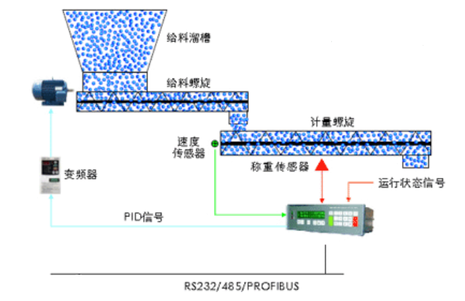 螺旋稱重定量給料機(jī)用于對散狀物料的定量給料,給料過程為螺旋旋轉(zhuǎn)連續(xù)給料,將來自于用戶給料倉或其他給料設(shè)備的物料輸送并通過稱重橋架進(jìn)行重量檢測;同時裝于端部的測速傳感螺旋體進(jìn)行速度檢測;被檢測的重量信號及速度信號一同送入稱重控制器進(jìn)行微積分處理并顯示以噸每小時為單位的瞬時流量及以噸為單位的累計量。