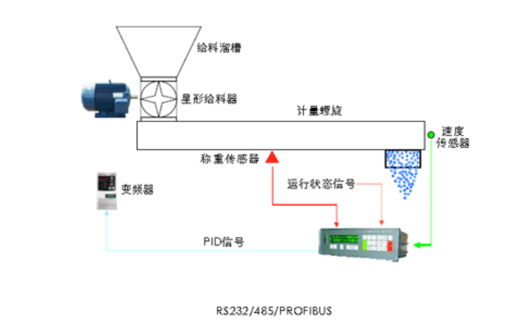 螺旋稱重定量給料機(jī)用于對散狀物料的定量給料,給料過程為螺旋旋轉(zhuǎn)連續(xù)給料,將來自于用戶給料倉或其他給料設(shè)備的物料輸送并通過稱重橋架進(jìn)行重量檢測;同時裝于端部的測速傳感螺旋體進(jìn)行速度檢測;被檢測的重量信號及速度信號一同送入稱重控制器進(jìn)行微積分處理并顯示以噸每小時為單位的瞬時流量及以噸為單位的累計量。