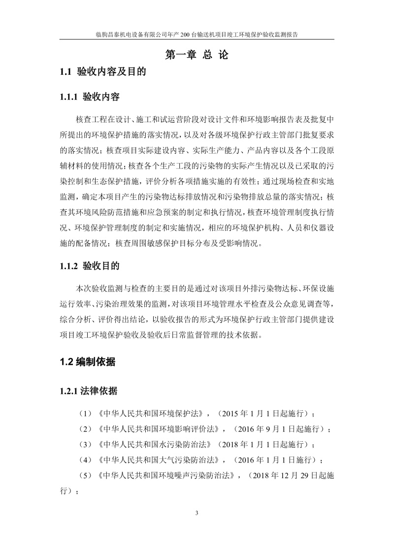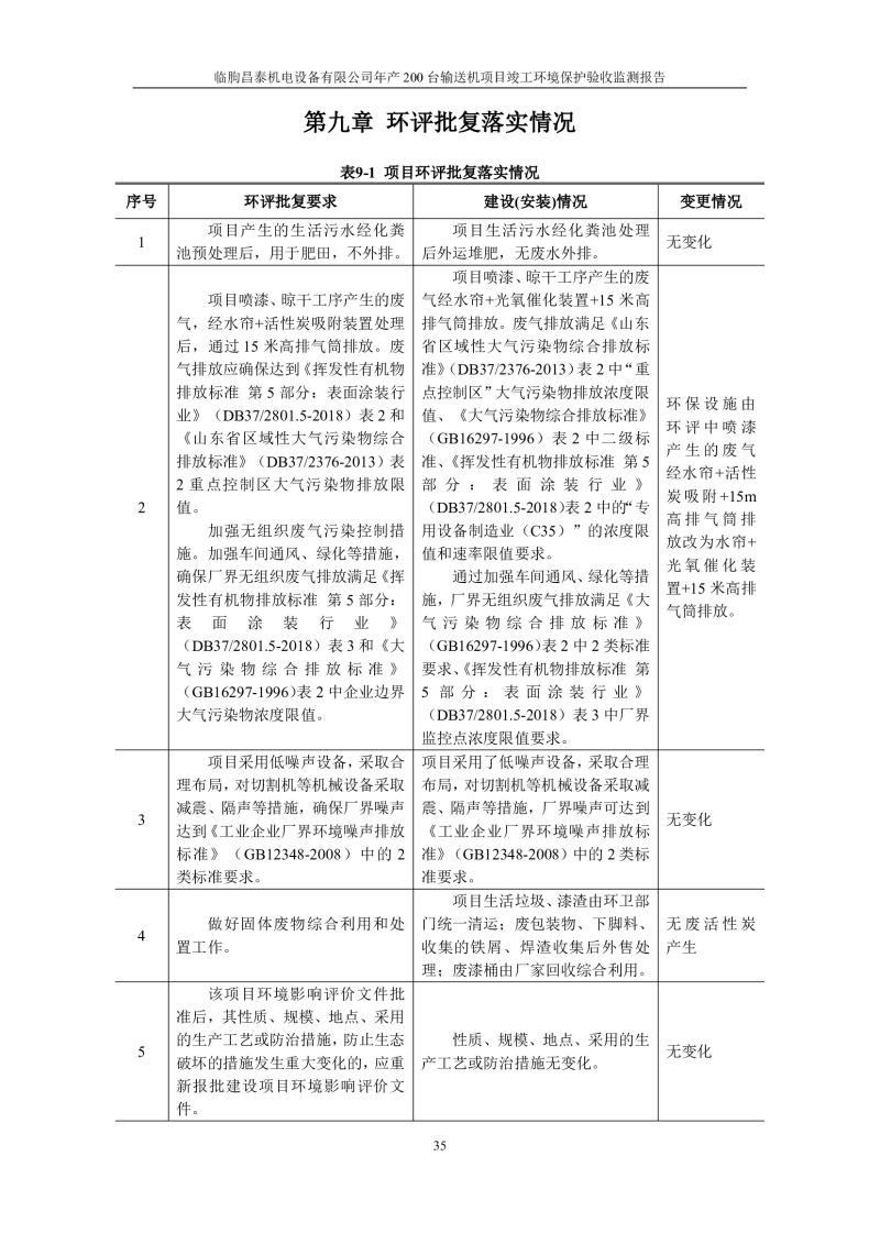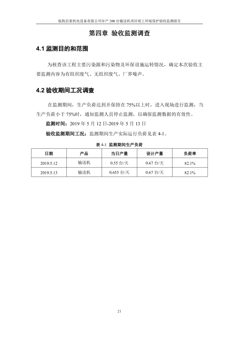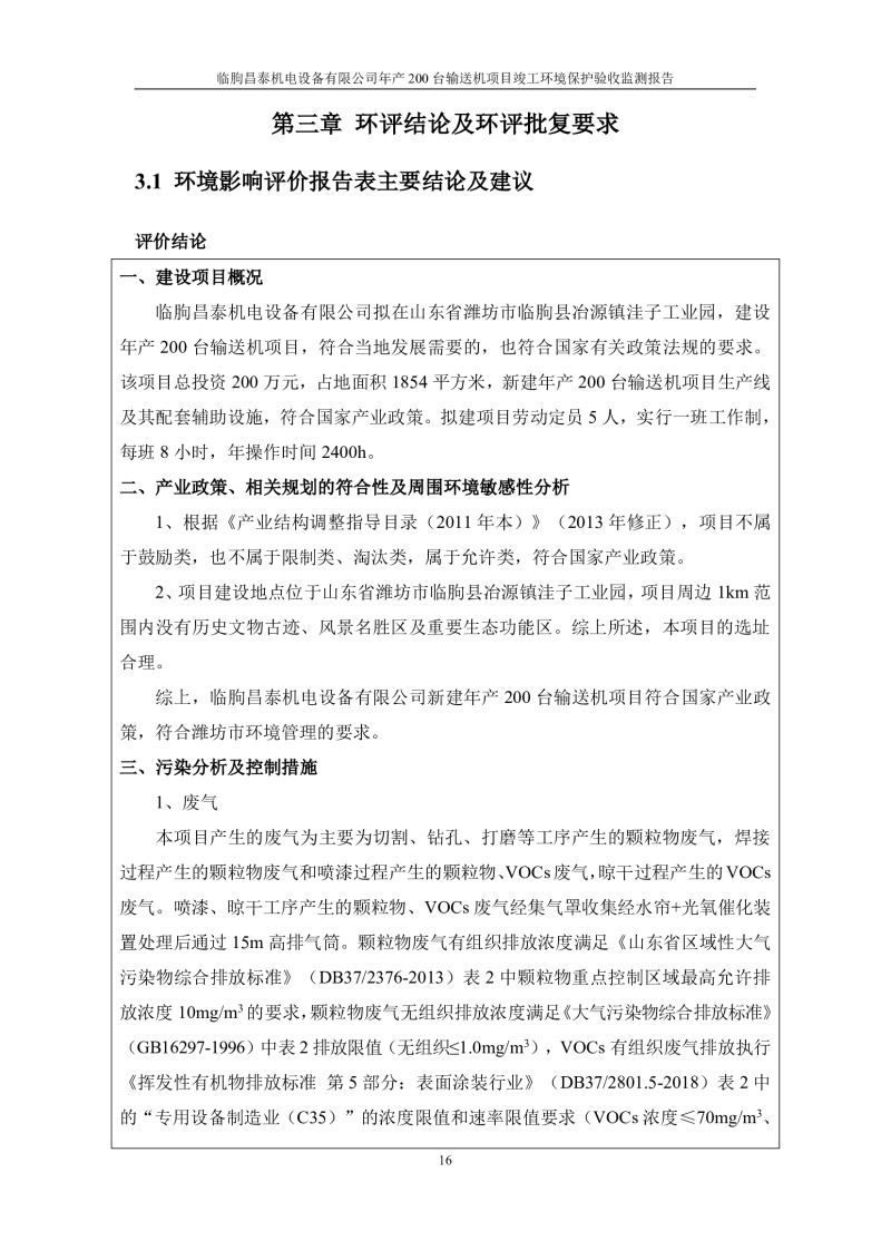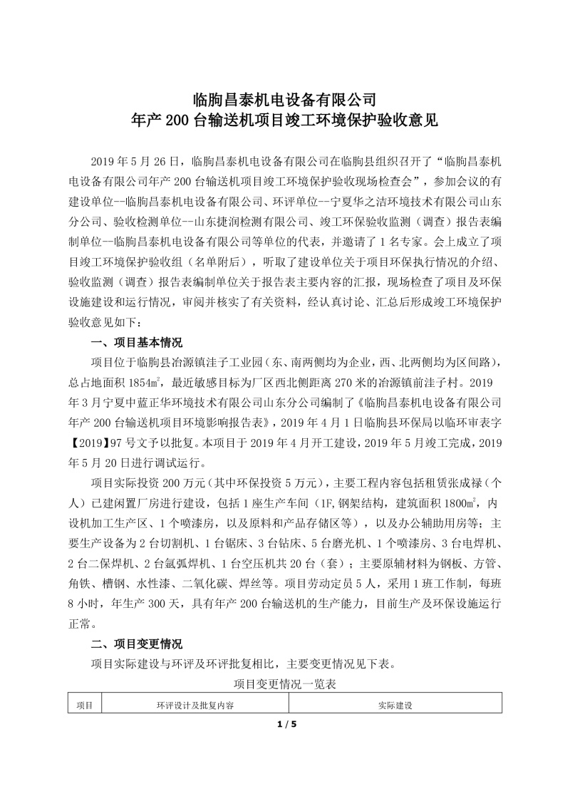 根據(jù)《建設(shè)項目竣工環(huán)境保護驗收管理辦法》(原國家環(huán)保總局令第13號)、《建設(shè)項目竣工環(huán)境保護驗收暫行辦法》、《建設(shè)項目竣工環(huán)境保護驗收技術(shù)指南 污染影響類》(生態(tài)環(huán)境部公告[2018]9號)的有關(guān)規(guī)定,臨朐昌泰機電設(shè)備有限公司現(xiàn)將年產(chǎn)200臺輸送機項目竣工環(huán)境保護驗收監(jiān)測報告表、其他需要說明的事項等內(nèi)容公示如下: