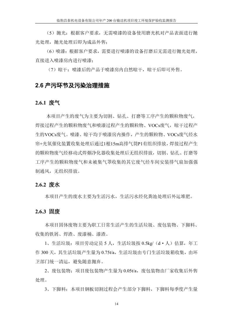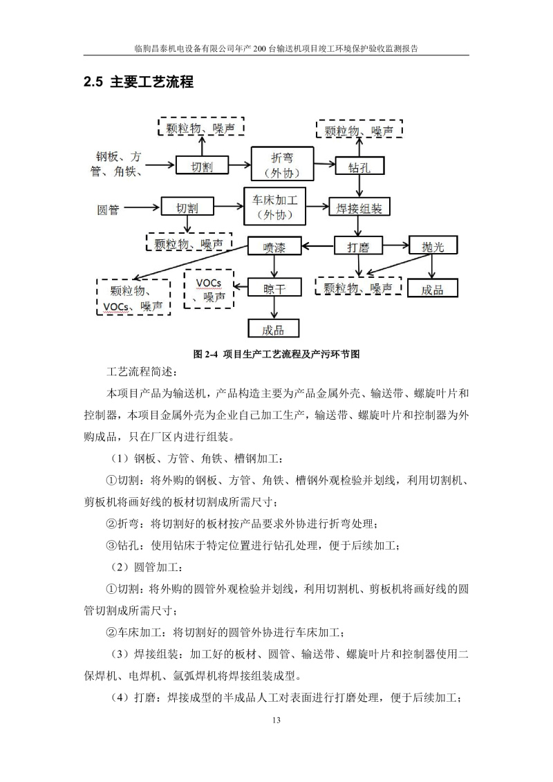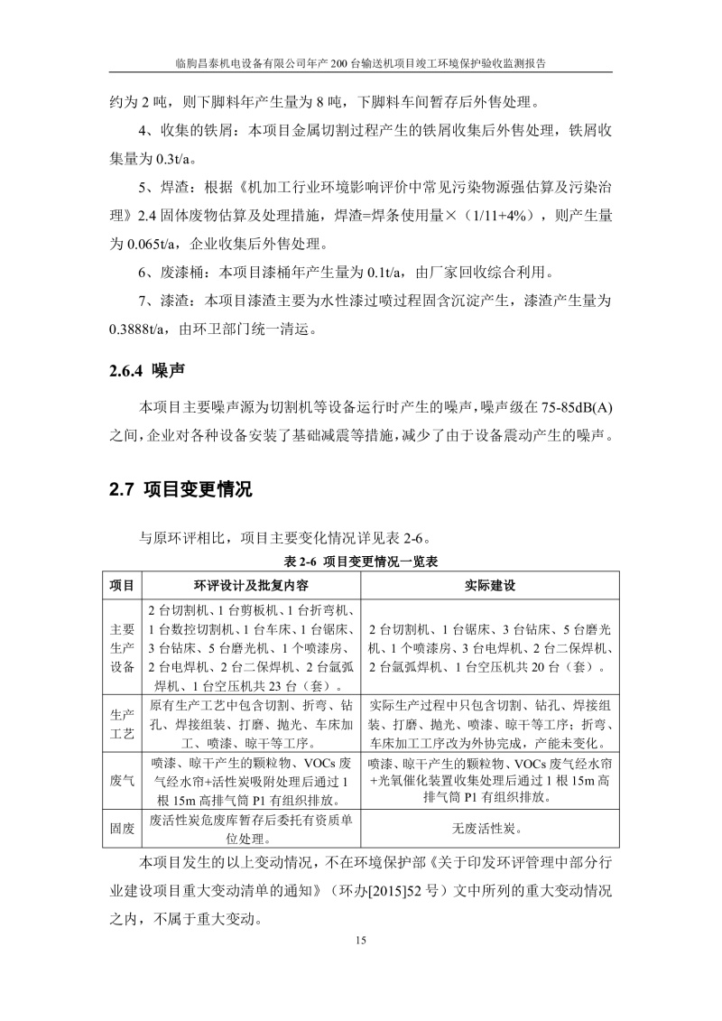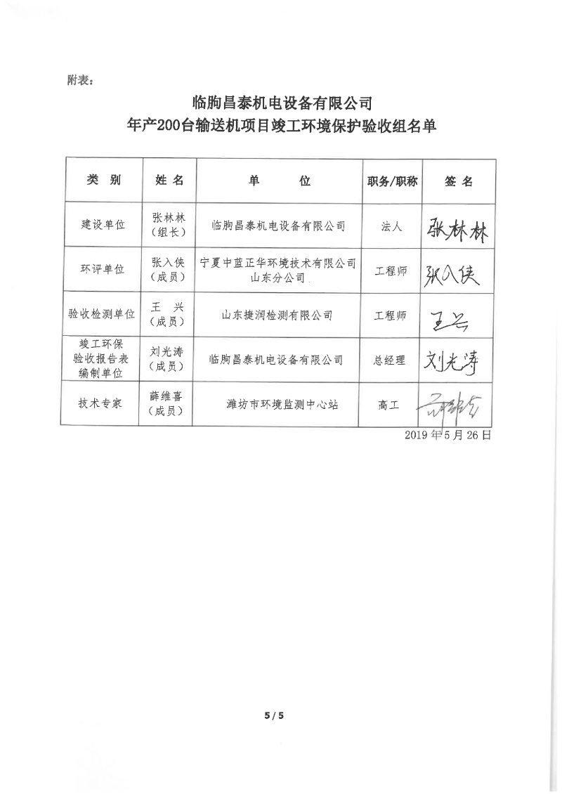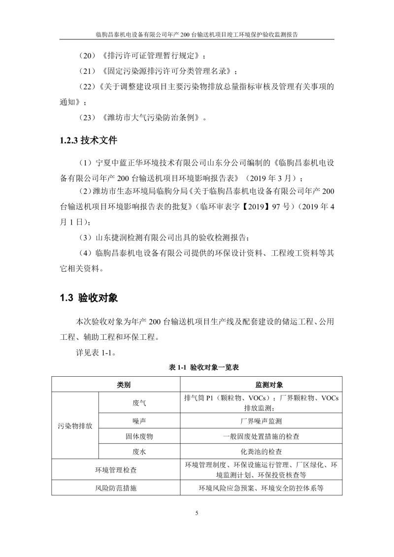 根據(jù)《建設(shè)項目竣工環(huán)境保護驗收管理辦法》(原國家環(huán)保總局令第13號)、《建設(shè)項目竣工環(huán)境保護驗收暫行辦法》、《建設(shè)項目竣工環(huán)境保護驗收技術(shù)指南 污染影響類》(生態(tài)環(huán)境部公告[2018]9號)的有關(guān)規(guī)定,臨朐昌泰機電設(shè)備有限公司現(xiàn)將年產(chǎn)200臺輸送機項目竣工環(huán)境保護驗收監(jiān)測報告表、其他需要說明的事項等內(nèi)容公示如下:
